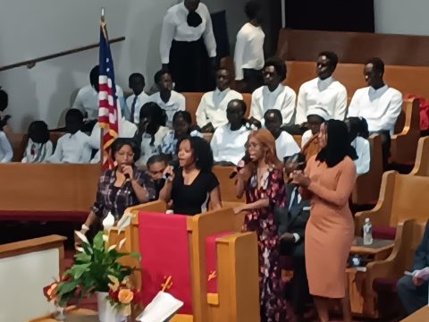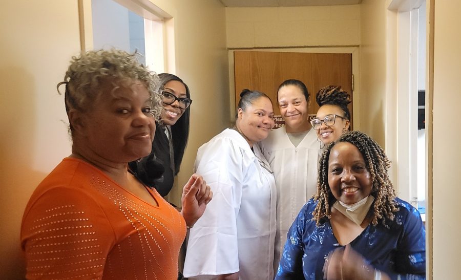 Deaconesses Patricia W, Christie M, Britne M, and Evelyn M assisting Sharon baptismal candidates Shalonda B and Julie W.